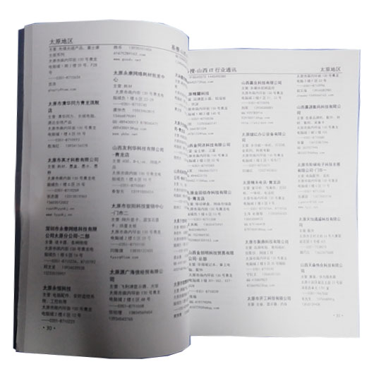 此次的易搜《山西IT行业通讯》封面采用250克铜板纸彩色覆膜精包装印刷,刊头以往黄色为主;本书收集了太原、朔州、忻州、大同、阳泉、晋州、长治、晋城、临汾、吕梁、运城11个地级市及周边县市的IT商家信息,内容包括商家电话、手机、联系人、QQ、邮箱、网址等等!!